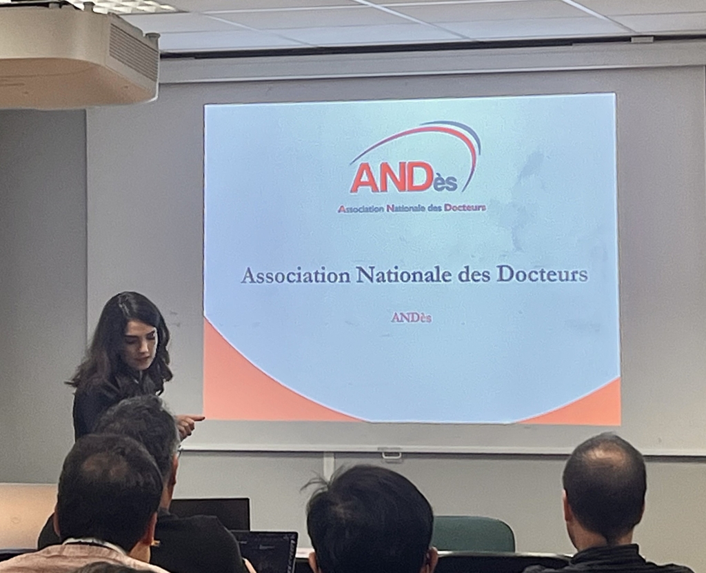 Invitée dans le cadre du meeting mensuel du pôle SPICES, elle s’est adressée à un public composé de doctorants, de chercheurs contractuels et de chercheurs seniors du laboratoire, spécialisés en matériaux, en physique et en nanotechnologies. Son intervention a permis de présenter l’ANDès, ses objectifs, ses missions et ses valeurs, ainsi que son action au niveau européen à travers sa collaboration avec Eurodoc. Dr Taoum a également mis en lumière les différentes opportunités d’engagement, de mise en réseau et de valorisation du doctorat offertes par l’association.